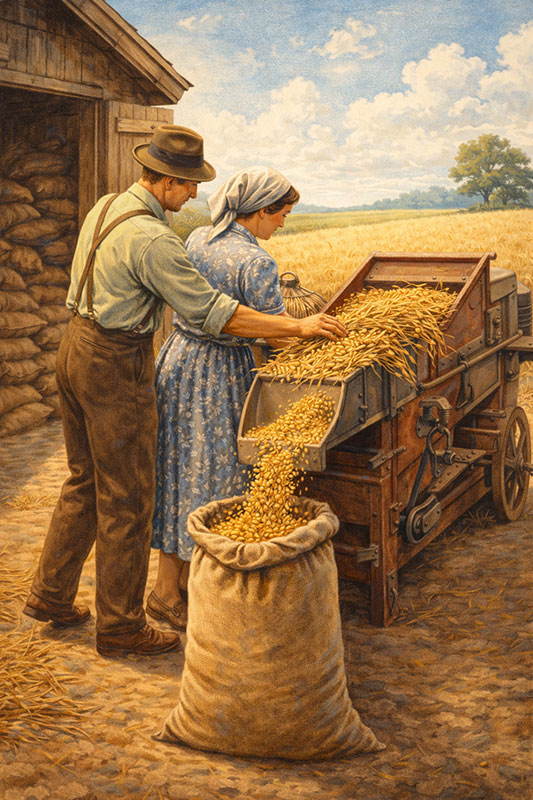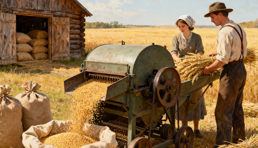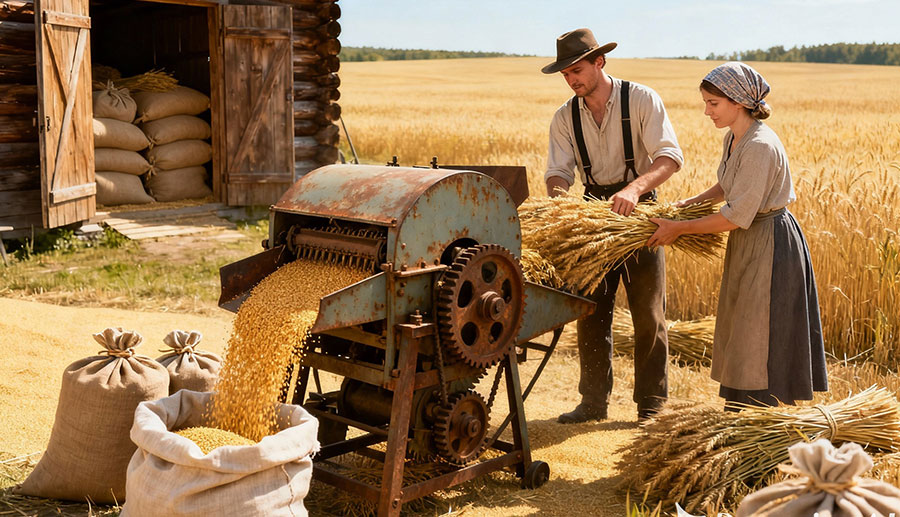 vilja työnnettiin puimakoneeseen